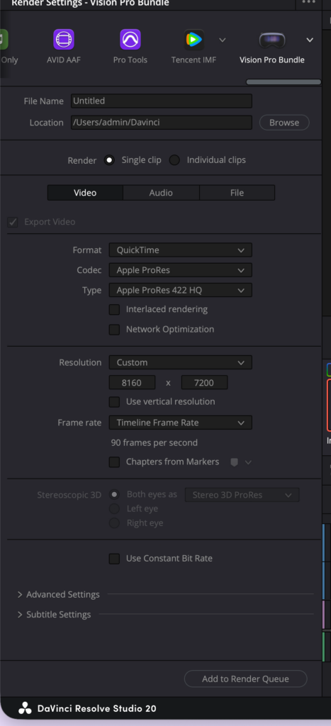 next tried export to Vision Pro bundle pro res, manually type in 8160×7200 and now I get a Vision Pro bundle file stereo prores, its not MV-HEVC? it is two tracks?